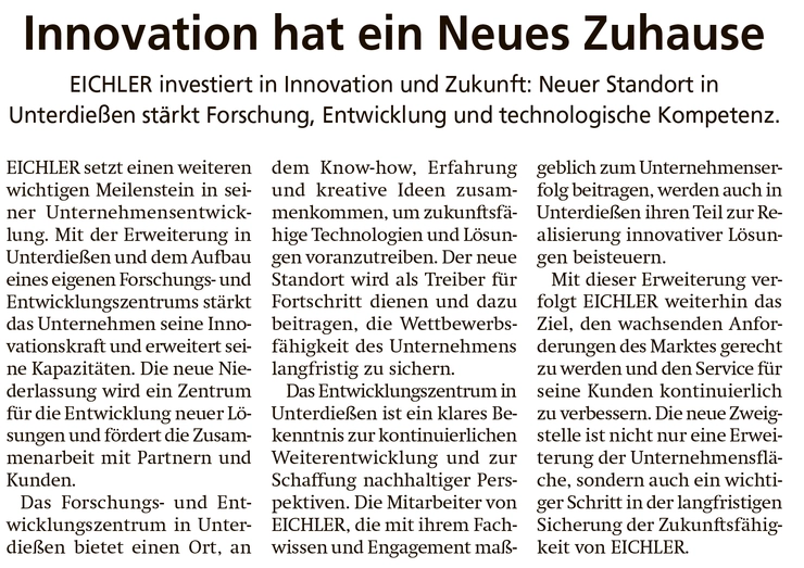 EICHLER investiert in INnovation und Zukunft. Der neue Standort in Unterdießen stärkt Forschung, Entwicklung und technologische Kompetenz.